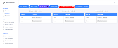 Ce projet a permis d’optimiser la gestion des cours du centre équestre en offrant une interface simple et intuitive. Grâce à l’agenda interactif et à la gestion des cavaliers, il améliore la planification et facilite l’association entre cavaliers et chevaux.